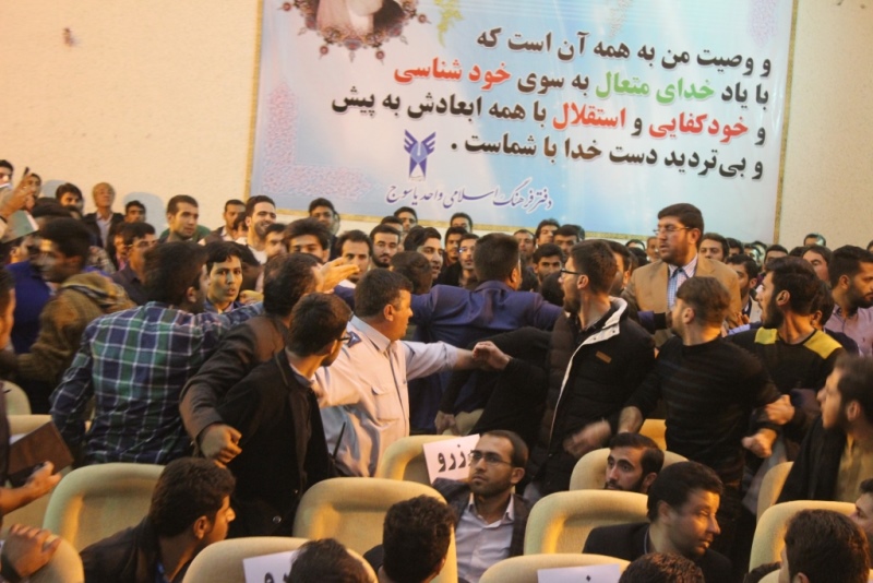 بنا بر این گزارش، جمعی از دانشجویان در این جلسه شعارهای مرگ بر احمدی نژاد، زنده باد اصلاحات سر می دادند و برخی دیگر از دانشجویان در پاسخ به آنها شعار مرگ بر خاتمی و مرگ بر فتنه گر سر می دادند.