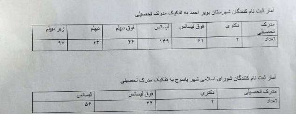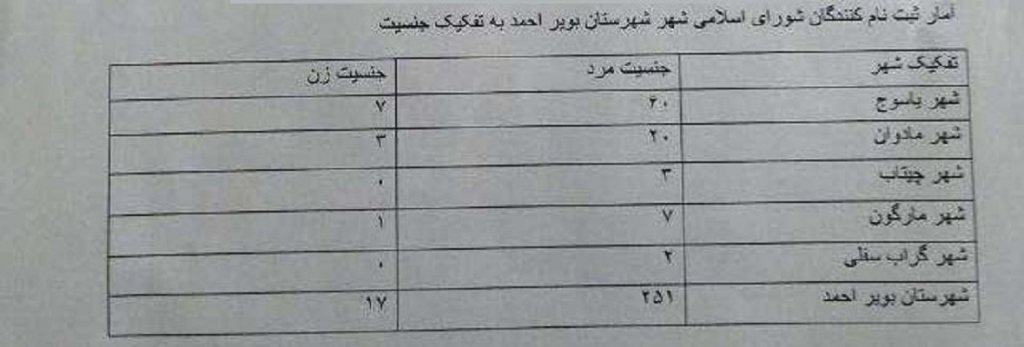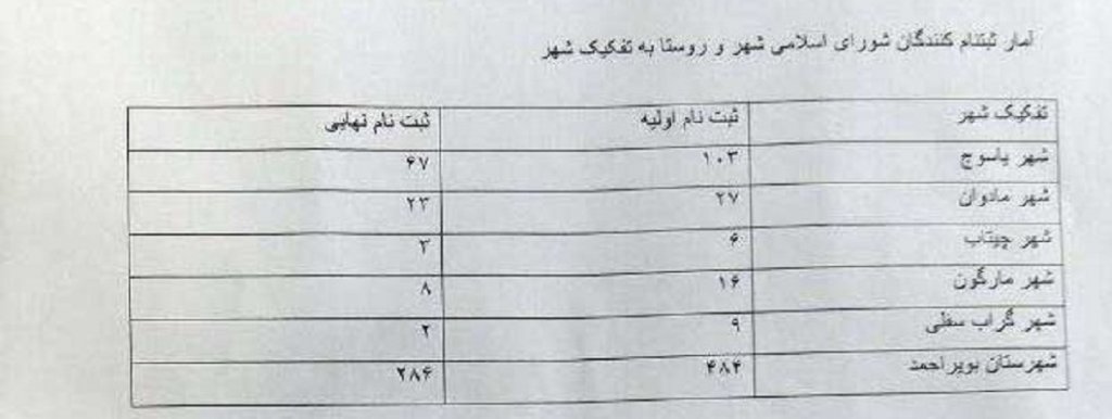 به گفته پناهی آمار ثبتنام کنندگان شوراهای اسلامی شهرهای شهرستان بویراحمد به شهر زیر است؛ ( این جدول تا روز سوم ثبتنام از نامزدهای انتخابات میباشد.)