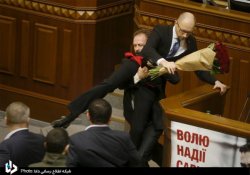 به گزارش پايگاه خبري تحليلي چهارفصل، ؛خست وزیر اوکراین روز گذشته برای ارائه گزارش عملکرد سالانه دولت این کشور در پارلمان حضور یافته بود و هنوز چند دقیقه از سخنرانی وی در پارلمان نگذشته بود که یکی از نمایندگان از جناح «پترو پوروشنکو» به نام «اولگ بارنی» به پشت تریبون آمده و یاتسنیوک را بغل کرده و از جایگاه سخنرانی دور کرد.