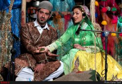 آنچه در بالا خواندید و دیدید؛ مراسم واقعی عقدِ یک دختر و پسر عشایر کهگیلویه و بویراحمدی بود. در این مراسم عروس و داماد همراه با اقوام و خویشان؛ نمایشی واقعی از رسم و رسوم خود را در صحنهای در گالری آسمان واقع در زعفرانیه ارایه کردند. این مراسم به همت کارگروه مد و لباس وزارت فرهنگ و ارشاد اسلامی، فرهنگستان هنر و موسسه فرهنگی و هنری صبا صبح امروز (۶ در ماه) برگزار شد تا شاید نمونهای باشد در یادبودِ رسم و رسوم ایرانی. در این مراسم زنان و مردانی پوشیده در لباسهای رنگارنگ محلی از ۱۸ استان دیگر نیز حضور داشتند که هریک با پوشاک مخصوص استان؛ فرهنگ و زیباییهای استان خود را به نمایش میگذاشتند.